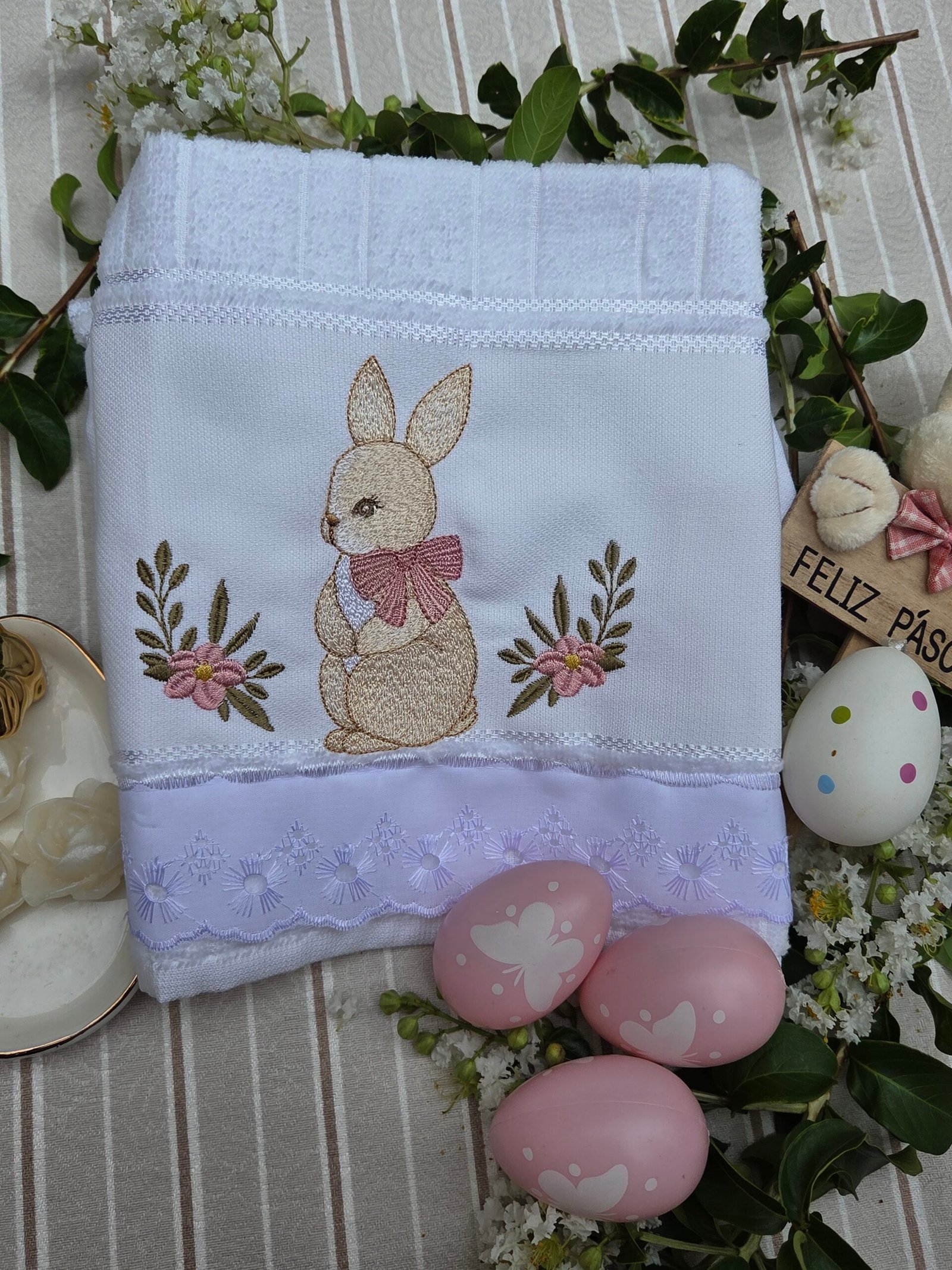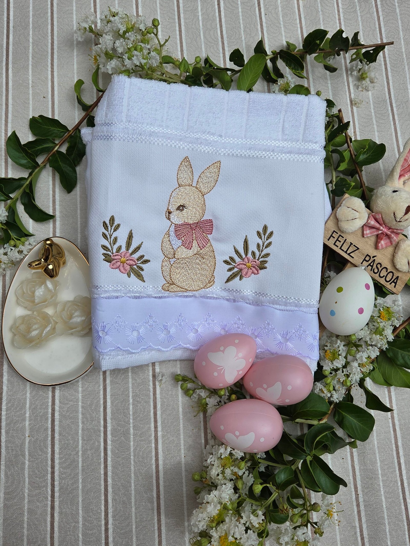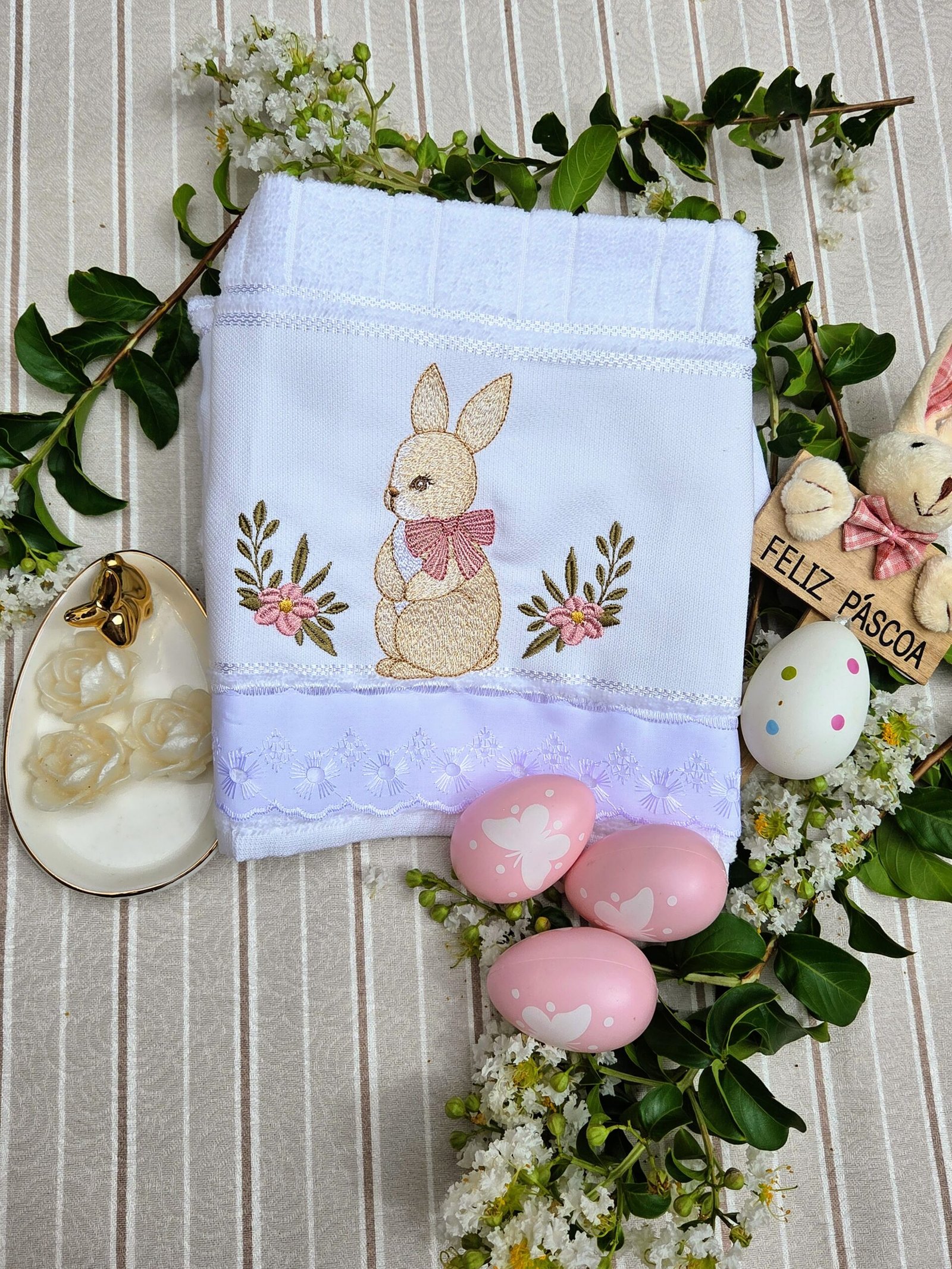 Dê um toque de elegância e sofisticação ao seu lavabo com este jogo de toalhas rosto e lavabo bordadas com o tema páscoa